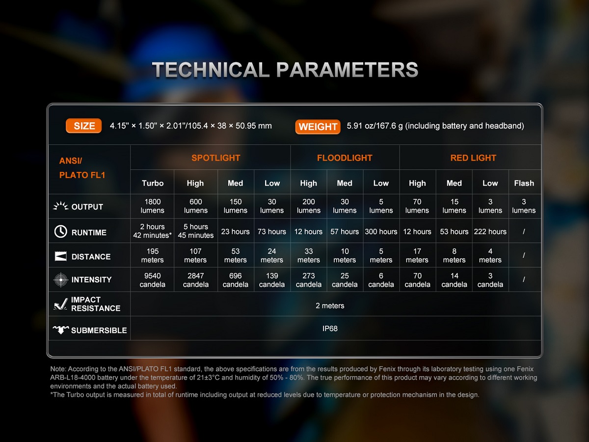 Note: According to the ANSI/PLATO FL1 standard, the above specifications are from the results produced by Fenix through its laboratory testing using one Fenix ARB-L18-4000 battery under the temperature of 21±3°C and humidity of 50% – 80%. The true performance of this product may vary according to different working environments and the actual battery used.